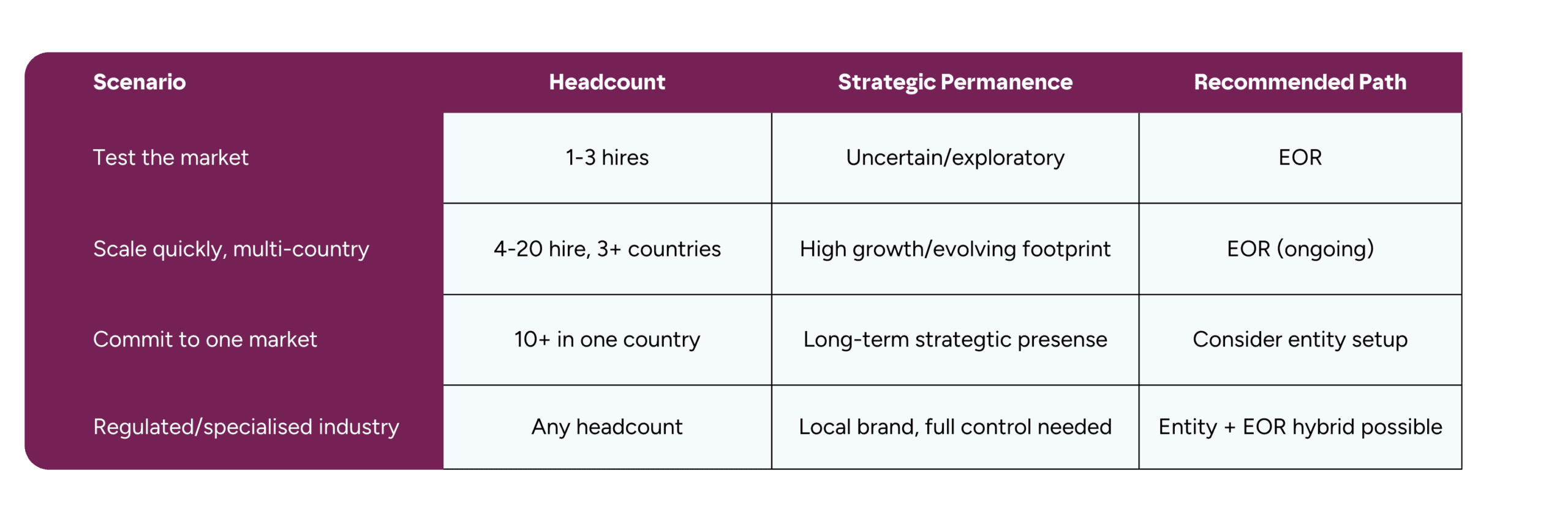 Rather than a binary choice, think of EOR vs. entity setup as a spectrum that maps to two key variables: headcount volume in the market, and strategic permanence of your presence there. The matrix below maps these two dimensions to a recommended path.