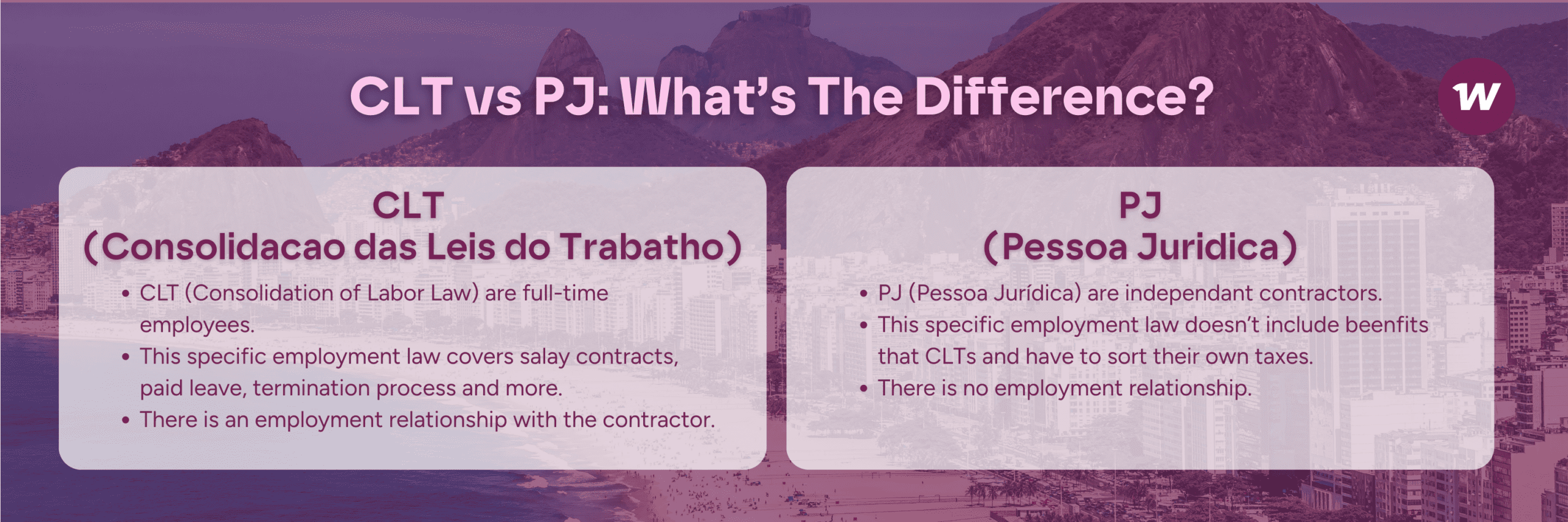 - PJ (Pessoa Juridica): Independent Contractor, who operates as a legal entity, issuing invoices and handling their own taxes and benefits.